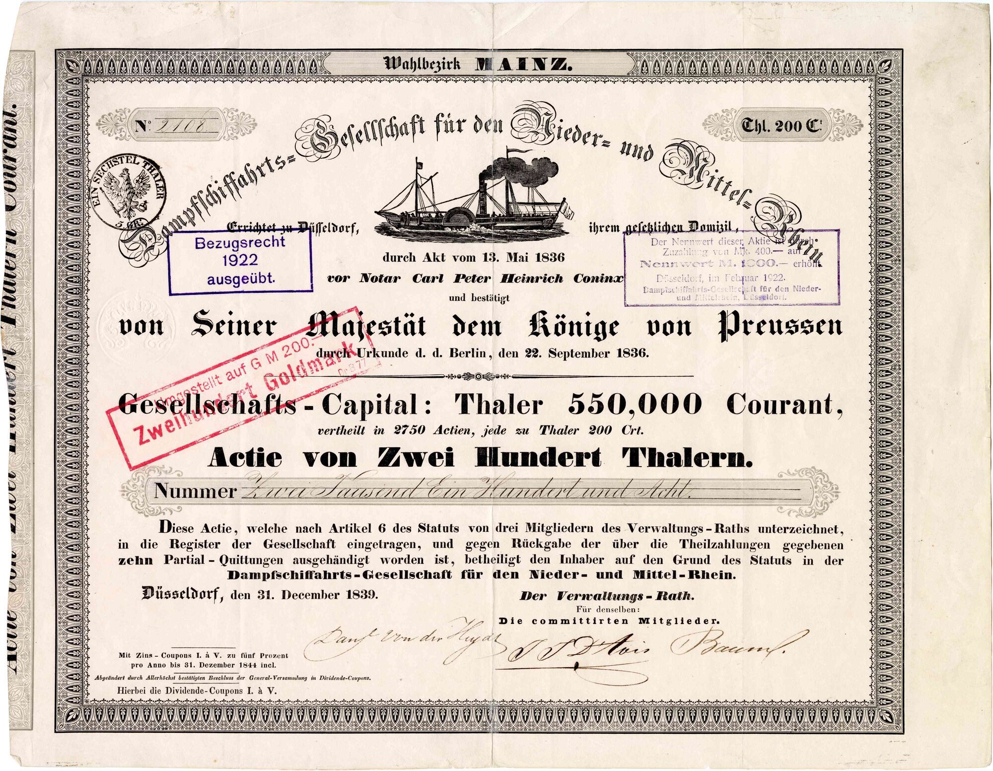 Namensaktie mit der Nummer 2108 aus der Erstemission vom 31. Dezember 1839. Originalunterschriften von Daniel von der Heydt, (Gerhard) Baum und J(ohann) J(acob) d’Avis. Letzterer war von 1849 bis 1853 Präsident der Handelskammer Mainz. Format: 35,5 cm x 28,3 cm. Ursprünglicher Nennwert 200 Taler Courant. Dabei handelte es sich um die Angabe in einer tatsächlich umlaufenden Währung. Nach der 1838 in Dresden beschlossenen Münzkonvention wurden aus 233,855 Gramm Feinsilber 14 Taler geprägt. Bei einem Silberpreis von 1,0585 € pro Gramm (30. Juli 2025) wies ein Taler den Wert von 17,68 € auf. Stempelaufdrucke mit den Umstellungen auf Goldmark und Mark (= Mk.) sind Ausdruck der bewegten deutschen Währungsgeschichte. Notierung der Aktie an den Börsen in Köln und Düsseldorf.