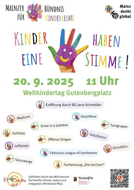 • Dem Mainzer Bündnis für Kinderrechte gehören zahlreiche Organisationen an: Mainz denkt global-Agenda-Büro der Landeshauptstadt Mainz, das Amt für Jugend und Familie (Haus der Jugend), das Evangelische Dekanat Mainz, Flüsterpost e.V. (Unterstützung für Kinder krebskranker Eltern), der Kinderschutzbund Mainz, UNICEF-Arbeitsgruppe Mainz, KIM – Kinder im Mittelpunkt e.V., afemdi-projekte Deutschland, das Junge Staatstheater Mainz (justmainz), TheaterRaum Mainz, Mobile - Ambulanter Kinder- und Jugendhospizdienst und der Stadtjugendring, die Stiftung Kinder.Gesundheit.Mainz, Human Help Network e.V. und die Stiftung Tagwerk und das Kinderpalliativ-Team Mainz.