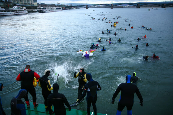 Das Mainzer Silvesterabschwimmen findet jährlich statt: Nach dem Startschuss durch den Oberbürgermeister um 10 Uhr springen dutzende Feuerwehrleute am 31. Dezember auf der Höhe des Kaisertors in den Rhein und schwimmen einen Kilometer durch den Fluss. Damit wollen die Feuerwehrleute die Aufgaben der Feuerwehr und der Wasserrettung sichtbar machen.