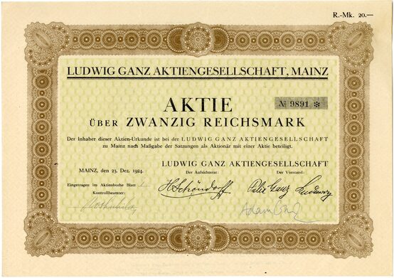 Inhaberaktie mit der Nummer 9891 der Ausgabe vom 23. Dezember 1923 im Nennwert von 20 Reichsmark. Format: 21,0 cm x 29,8 cm. Die Emission umfasste 24.200 Aktien im Nennwert von jeweils 20 Reichsmark und belief sich damit auf einen Gesamtbetrag von 484.000 Reichsmark. Als Besonderheit ist die Originalunterschrift von Prof. Adam Ganz, London, dem Urenkel von Felix Ganz, auf der Urkunde hervorzuheben.