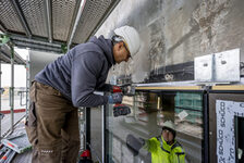 Der Einbau der Fenster ist weitestgehend abgeschlossen, das Anbringen der Fassade fokussiert nunmehr final auf die Fronten Jockel-Fuchs-Platz und die Str. Am Rathaus.
